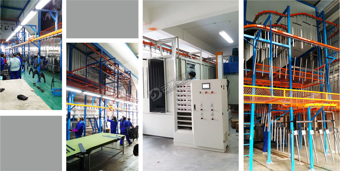 此涂裝線為電視機支架的全自動涂裝線,采用噴淋+游浸結(jié)合的前處理工藝,此線采用立體空間布線,上下三層設備,設備最高點11米高,大大節(jié)省了設備安裝空間。